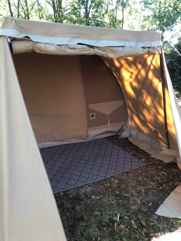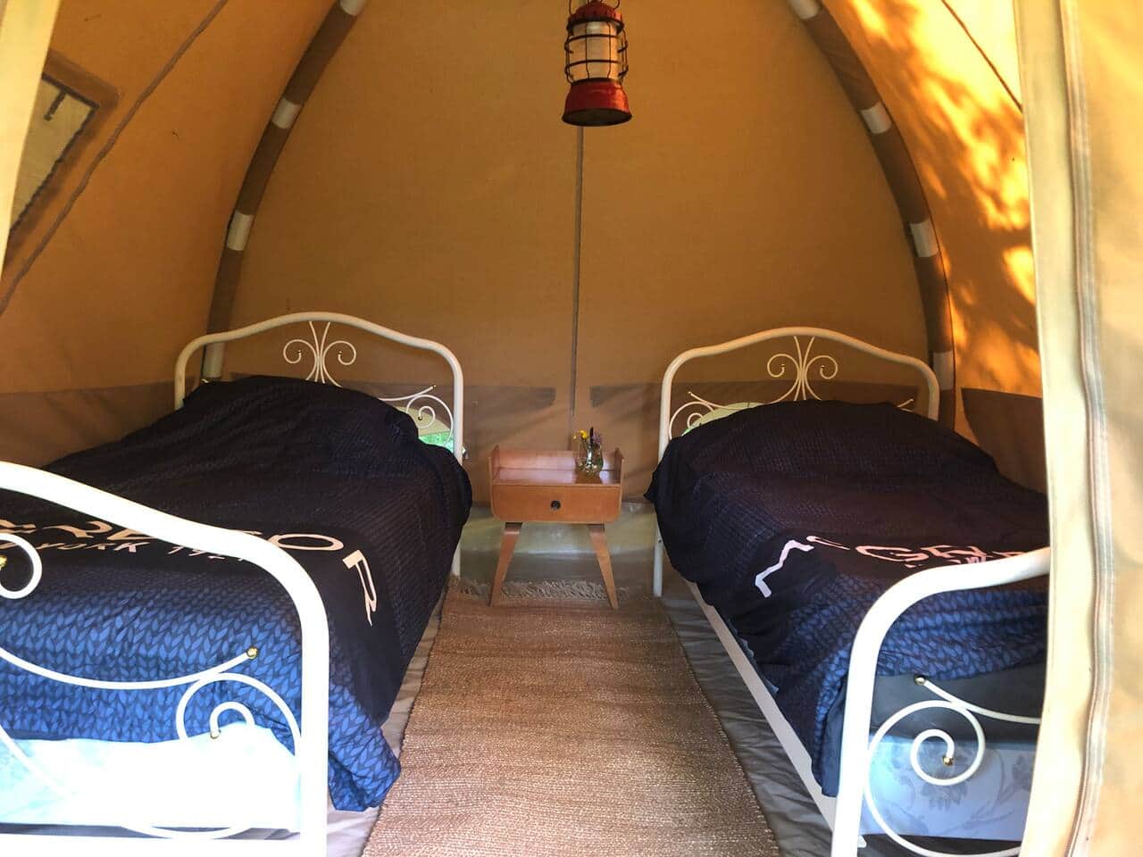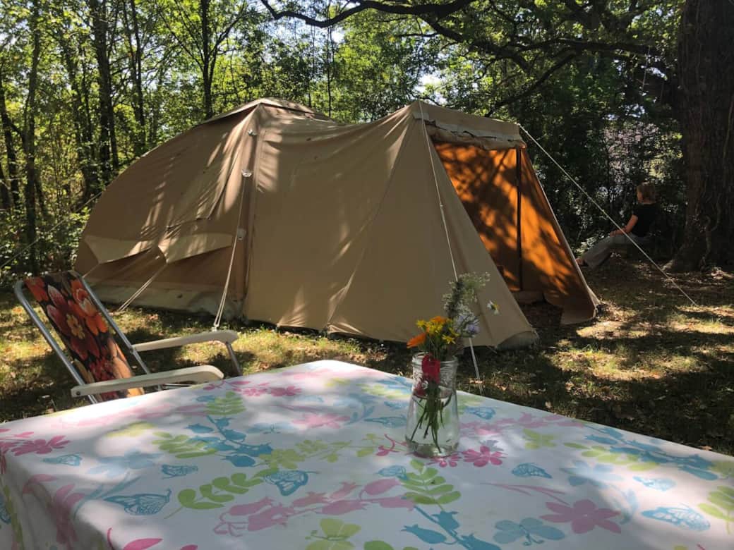 We hebben 5 ruime tentplaatsen, verscholen in ons schaduwrijke bos. Eén van deze 5 plekken is deze huurtent. De bedden in de tent zijn 90 cm breed en 190 cm lang. Tijdens je verblijf kun je gebruikmaken van een gedeelde buitendouche, een milieuvriendelijk toilet en een volledig uitgeruste buitenkeuken. De buitenkeuken is voorzien van een inductiekookplaat, waterkoker, koelkast en keukengerei.